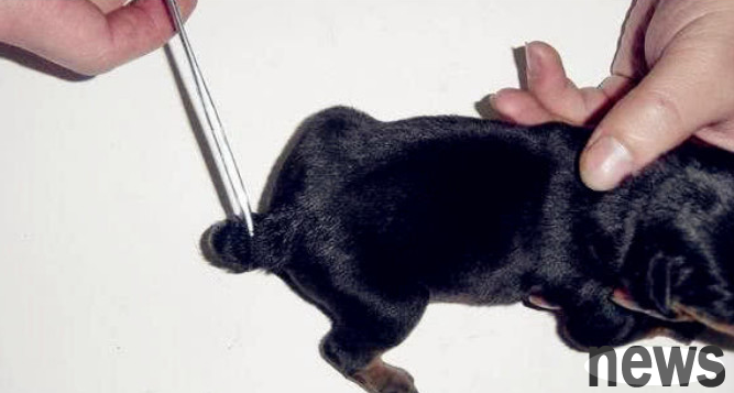 In the pet clinic, a newborn dog had its short tail cut off. The little dog lay motionless on the bed, and the doctor took the scissors and cut off the dog's tail. The dog is still small, and the remaining small section is still growing. Therefore, when the dog was older, a second surgical treatment was performed on it.