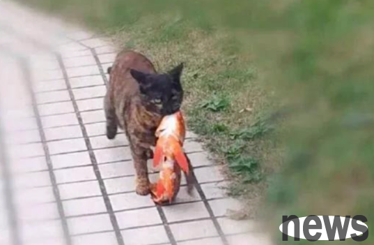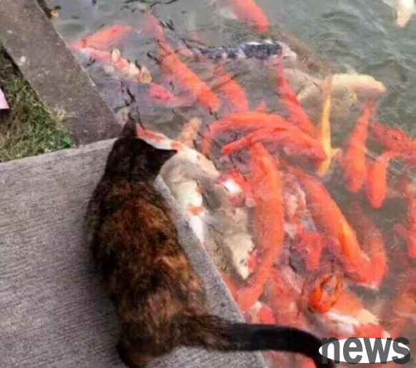 In the picture, the owner saw that after the cat walked to the lake, the goldfish in the lake thought someone was going to feed them, so they foolishly swam over on their own. The cat was very agile. After spotting one of them, he immediately stretched out his paws and fished it out.