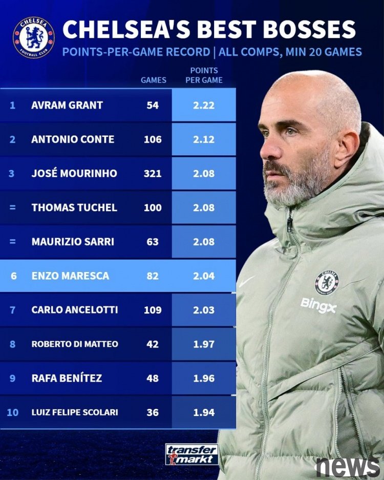 Chelsea defeated Burnley 2-0 in this round of the Premier League. Statistics show that Maresca's team's points per game have surpassed Ancelotti and risen to sixth place in team history.