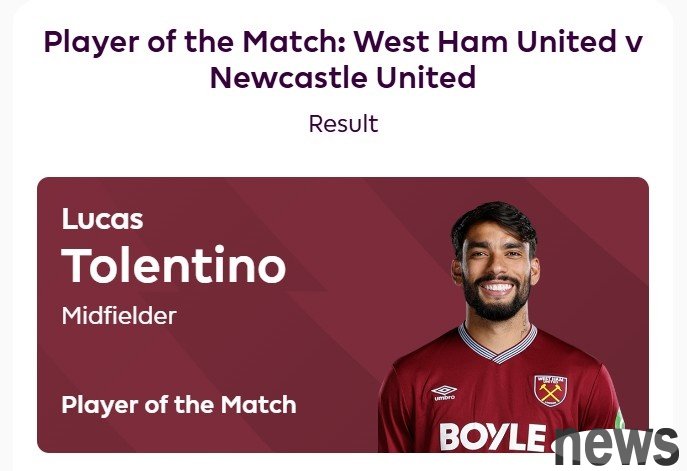 In the 10th round of the Premier League, West Ham United defeated Newcastle United 3-1 at home. According to official Premier League news after the game, Paqueta was named the best player in the game, receiving 43% of the votes.