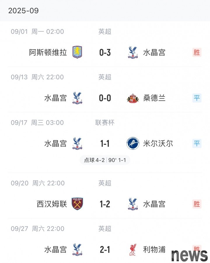 Crystal Palace remained undefeated in five games in September, including 3 wins and 1 draw in the Premier League. They successfully advanced to the League Cup through a penalty shootout. Crystal Palace also dramatically beat Liverpool at the end of the month, becoming the only unbeaten team in the Premier League that month. Coach Glasner was also successfully elected as the Premier League Coach of the Month in September.
