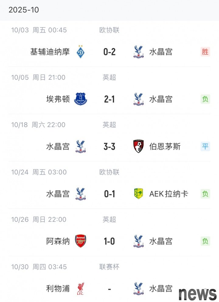 However, entering October, Crystal Palace's form has declined. First, they lost to Everton in the Premier League, and then lost to the Cypriot team AEK Larnaca in the UEFA Europa League. They lost to Arsenal last weekend. In Thursday's League Cup, Crystal Palace will face Liverpool again in the League Cup.