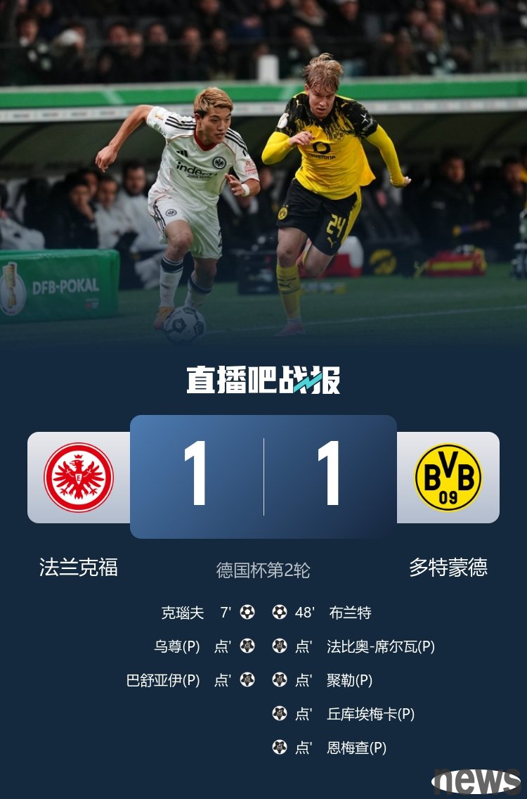 German Cup - Frankfurt advanced to the third round with multiple penalty kicks 5-3. Brandt scored and Anlu missed a point.