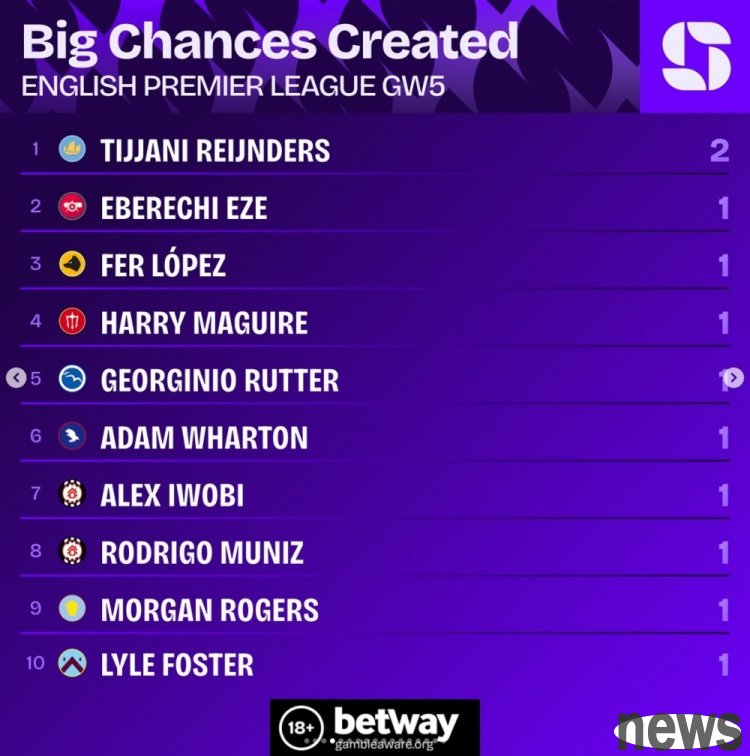 After the fifth round of the Premier League, squawkafootball listed various data rankings, and Reindes created two major opportunities in total, with the most in this round.
