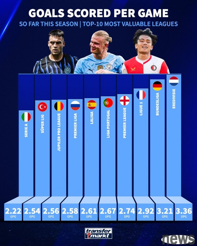 The German transfer market has compiled statistics on the average number of goals scored per game in the top 10 European leagues by total value, and listed the list. The Eredivisie ranks first with 3.36 goals, followed by the Bundesliga, Ligue 1, and Serie A with 2.22 goals at the bottom.