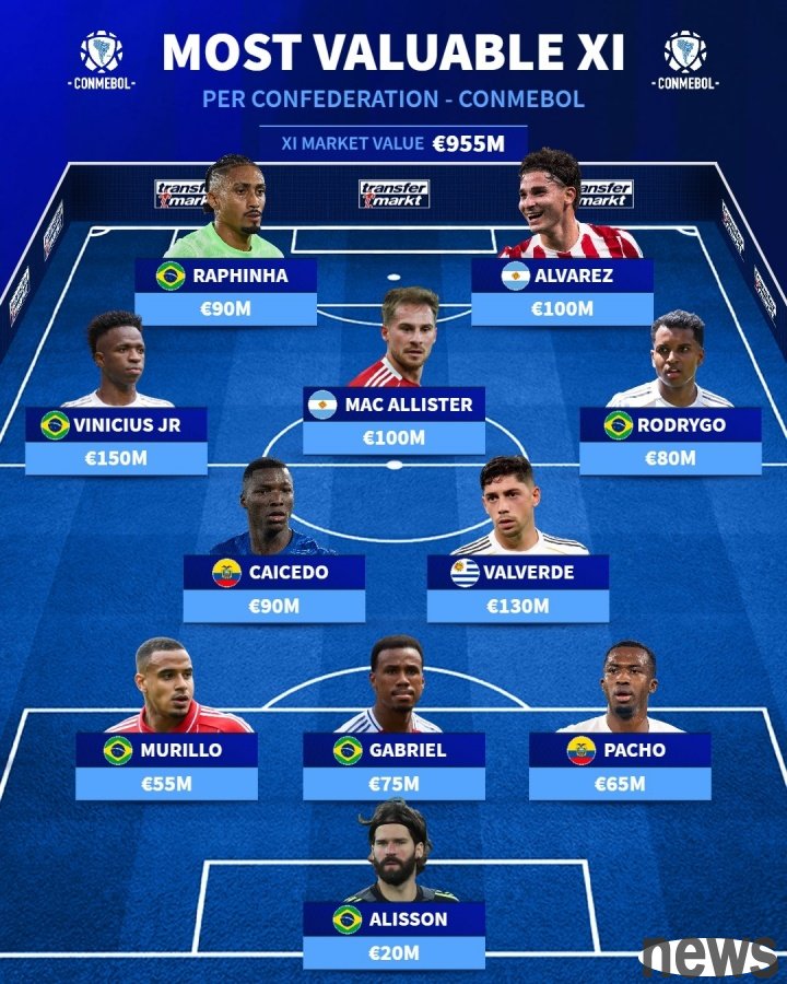 Dezhuan has taken stock of the most valuable lineup of CONMEBOL players. The total value of the entire lineup is as high as 955 million euros. Among them, Real Madrid winger Vinicius became the most valuable player with 150 million euros, followed by Valverde with 130 million euros.